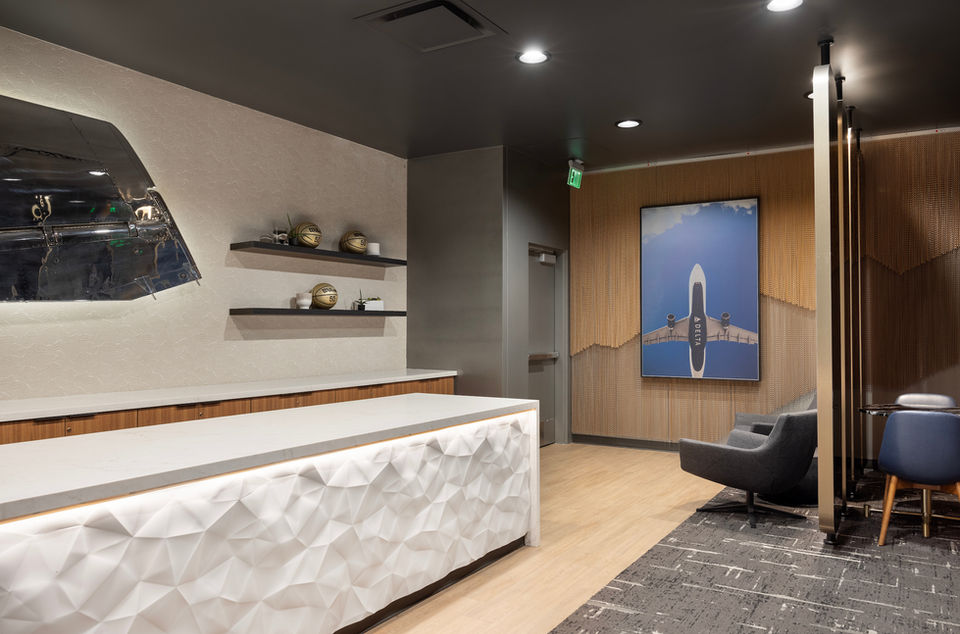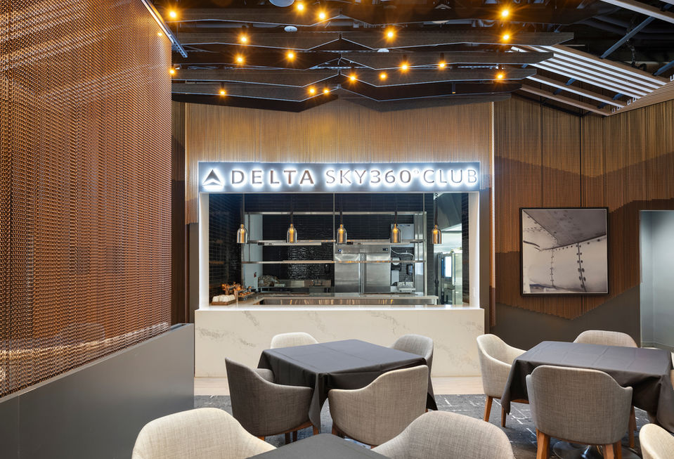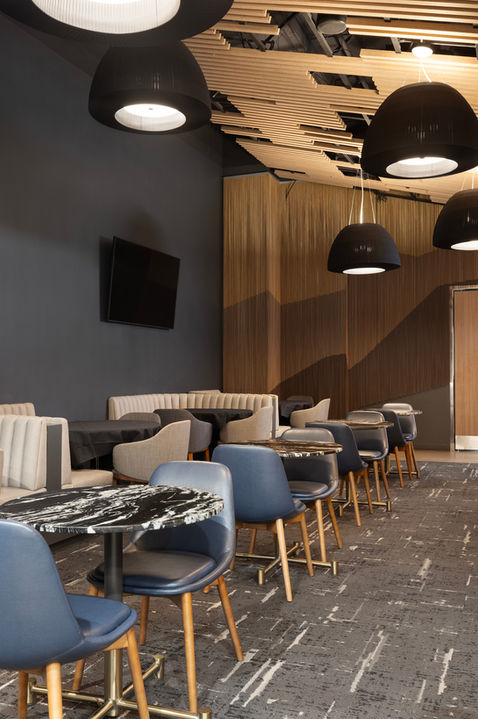 The club features a variety of semi-private dining areas, crafted for exclusivity. Booths and seating zones are artfully separated by chain link curtains, pill-shaped mirrors, and paracord dividers, a subtle nod to the basketball season. The ceiling was removed to provide height and acoustical baffles shaped like wings and a central jetway-inspired feature were added, paying homage to Delta Airlines, the club’s sponsor.
