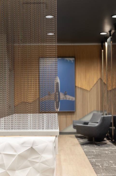 Walls are adorned with chain link curtains in an ombre bronze finish, forming a mountainous motif that reflects the local surroundings. Aviation-themed elements abound, with accent lights from airplane wings and window seats, complemented by metallic artwork layered over the chain link textures for added depth.