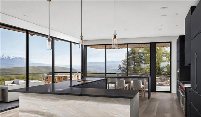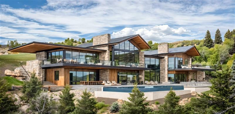The design of this home is inspired by its unique setting. The hillside gently guides you toward the golf course, fostering an intimate connection with the landscape. Nestled into the slope, the architecture feels grounded in its surroundings while opening to sweeping, unobstructed views of the ski resorts and offering a private perspective of the Painted Valley Golf Course. Floor-to-ceiling and corner windows frame the scenery, while the home’s position within the vale provides a serene, secluded retreat.