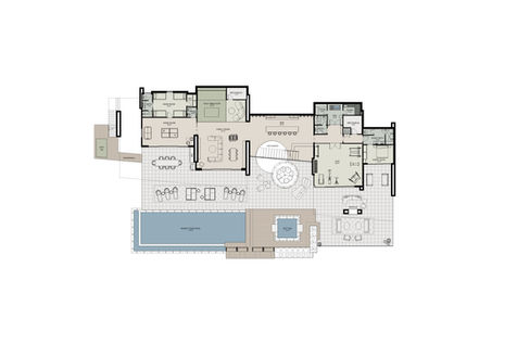 The home features a bridge leading to a glass-enclosed entry, with a sculptural staircase descending to a stylish bar below. Both the grand living area and primary suite open onto expansive decks, ideal for taking in the surrounding views. The lower level is designed for ultimate entertainment, featuring a golf simulator, game room, and seamless access to a large patio with an infinity-edge pool cascading over the hillside. A spacious gym and spa provide premier wellness amenities, while multiple guest rooms offer comfortable accommodations for family and visitors alike.