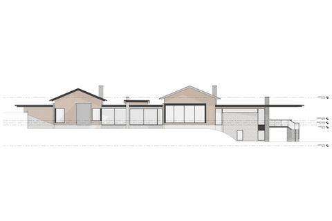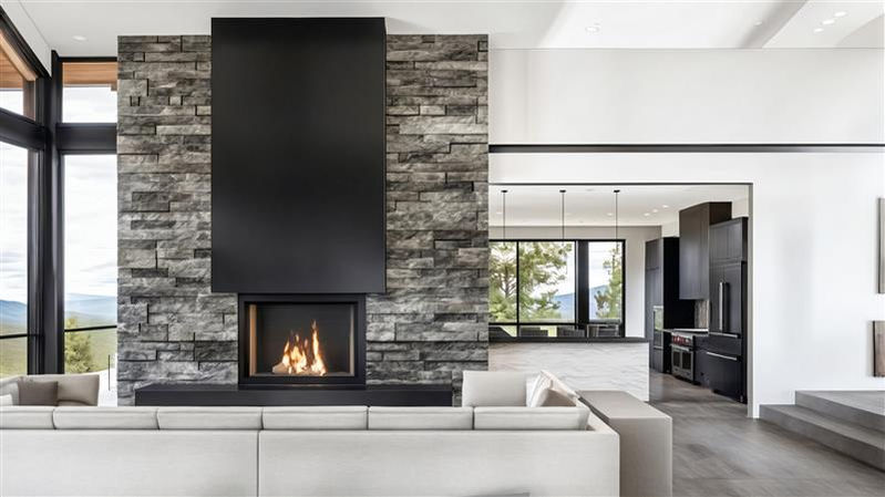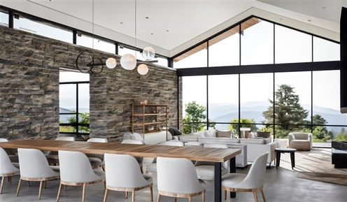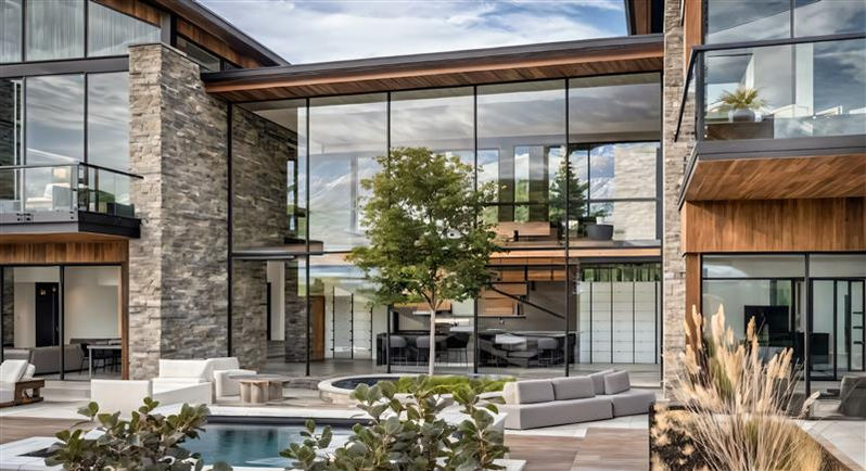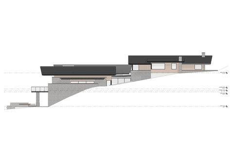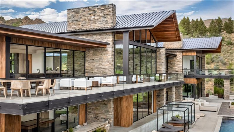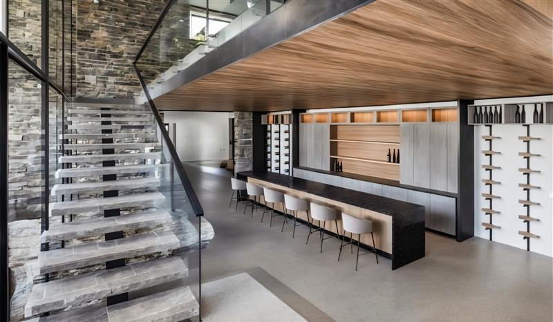 A bold, angled flat roof unifies the home’s two primary forms, while expansive decks below create a strong horizontal counterpoint that anchors the design to the hillside. Strong vertical stone elements further root the home into the terrain, and multiple fire features punctuate the decks, adding warmth and drama.